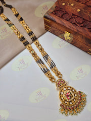 MATERIAL : Copper FINISHING : Rajwadi Finish STONE : Golden, Black Beads & red , Green Stone LENGTH : 42" Inches Embrace the grandeur of royal traditions with our Rajwadi Mangalsutra, a masterpiece that blends timeless elegance with regal charm.