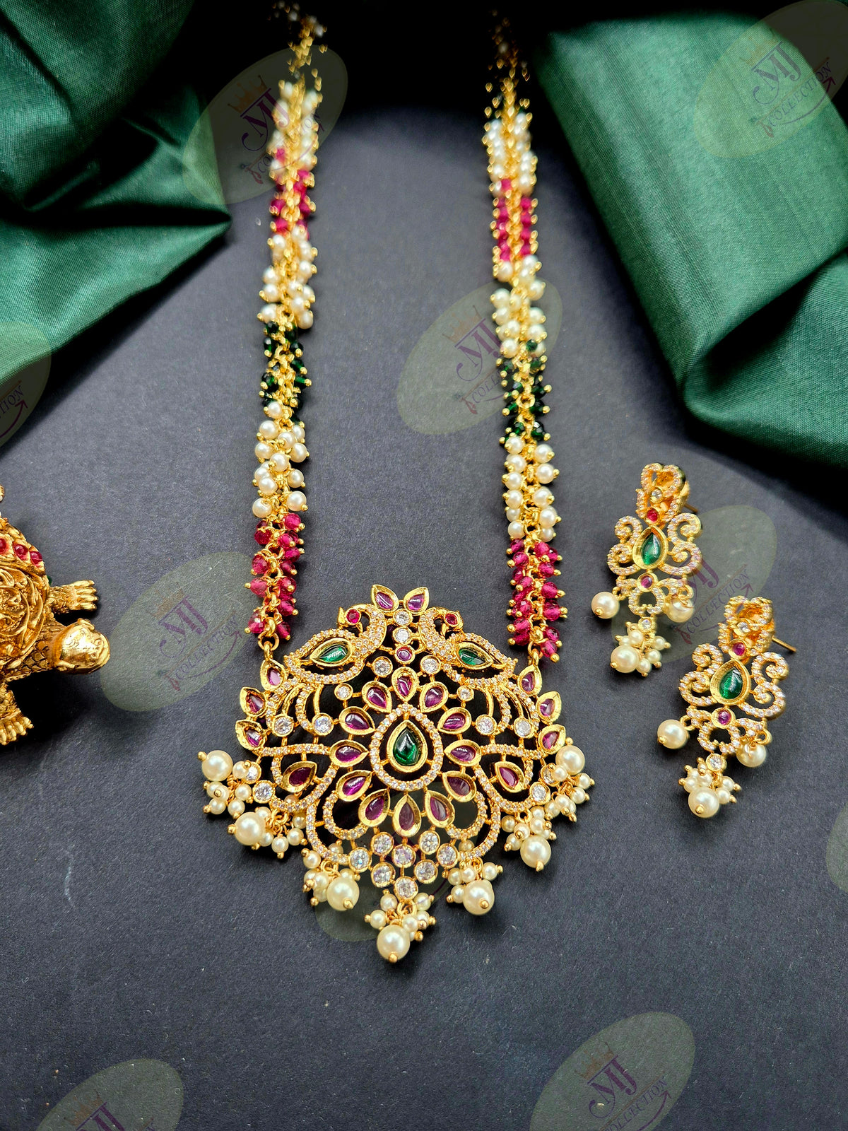 A timeless piece of Maharashtrian jewellery, crafted with elegance and tradition. This classic necklace is made with pearls woven in gajra, adorned with a central tanmani pendant that adds charm and grace.